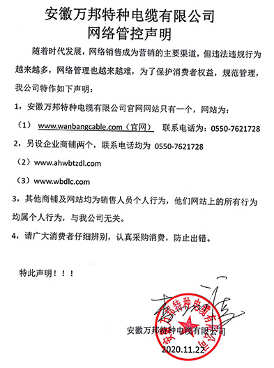 鄭重聲明:安徽萬邦特種電纜有限公司官方網站為:www_wanbangcable_com.czxinborui.com,除此之外無任何子網站或合作網站,其余均為假冒偽劣。電話:0550-7621728 13485756353 地 址:安徽省天長市滁州高新技術產業開發區經四路29號